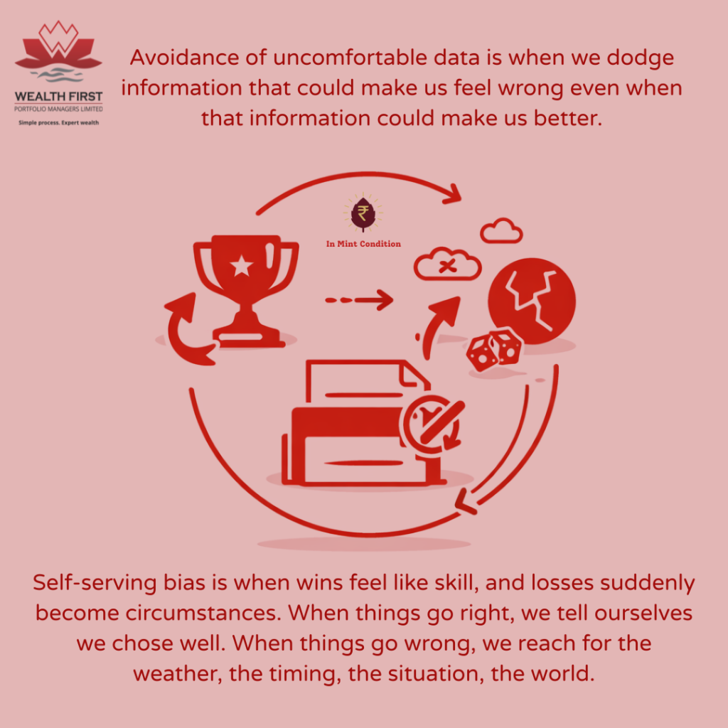 Self-serving bias: It is when wins feel like skill, and losses suddenly become circumstances. When things go right, we tell ourselves that we chose well. When things go wrong, we reach for the weather, the timing, the situation, the world, etc.